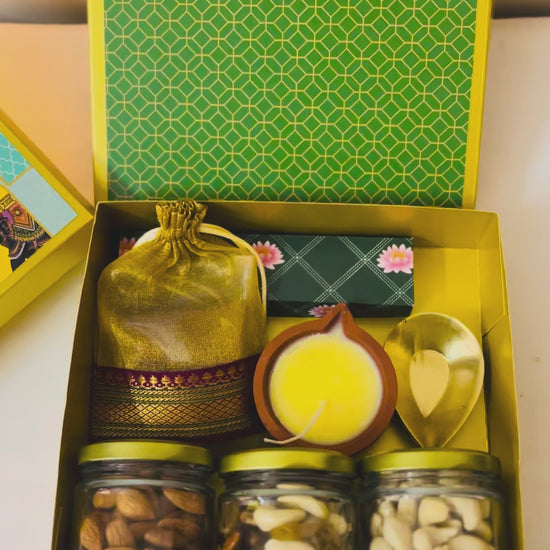 Diwali Premium Handmade Gift Box – Nuts, Candles, Brass Diyas & Mysorepak- Green