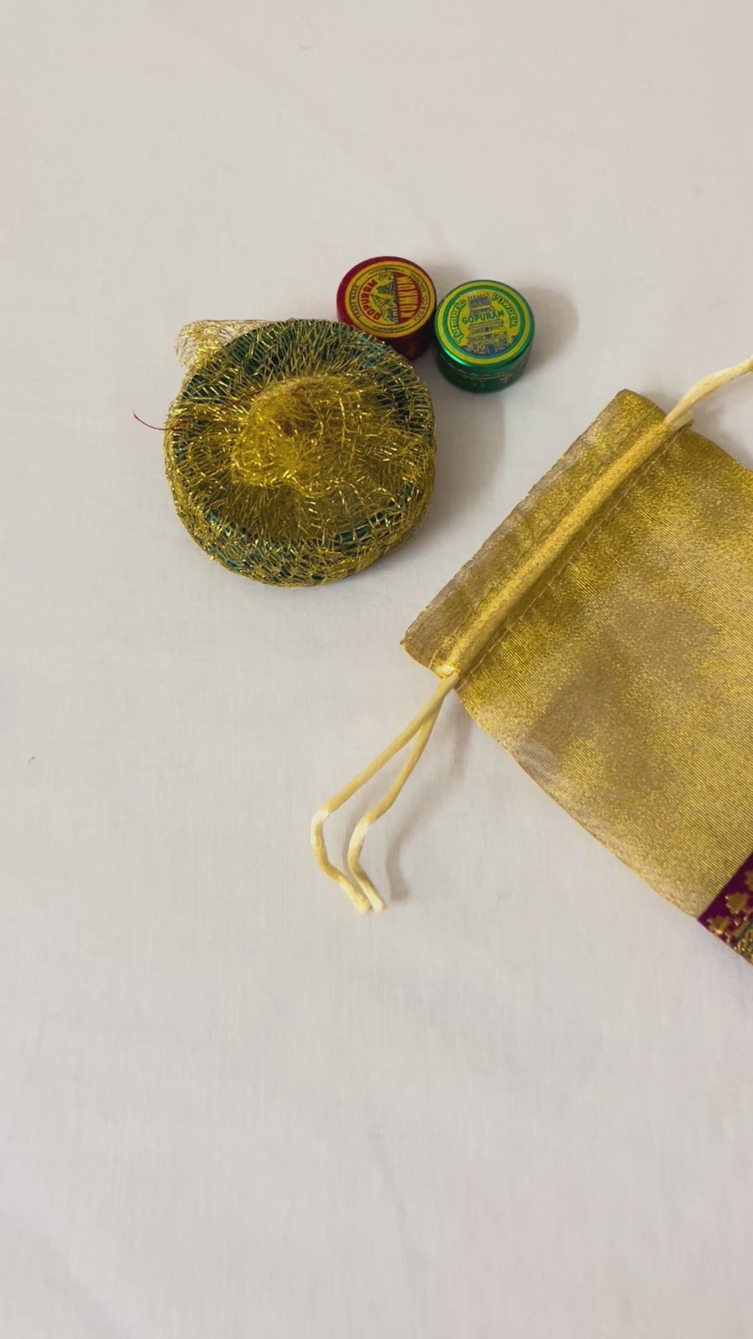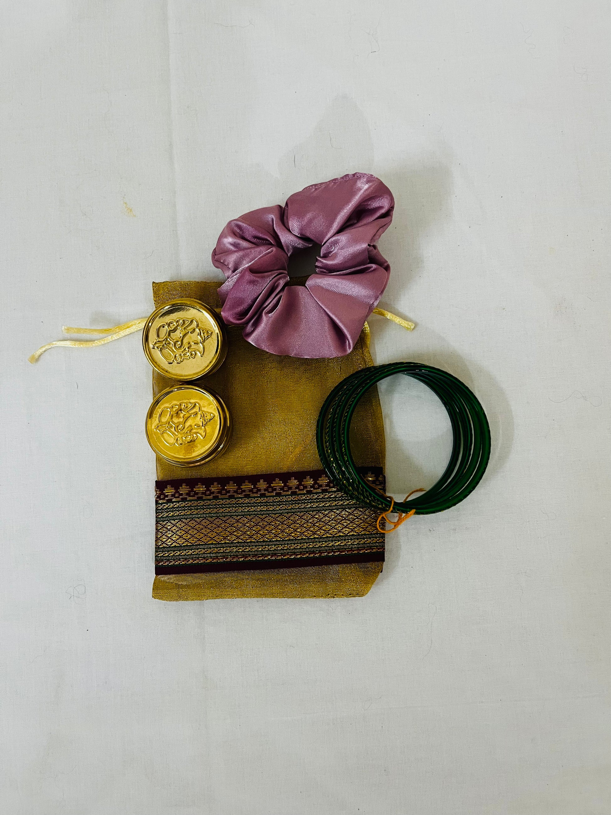 Pooja return gift presented in an elegant organza potli bag. Each pack includes 4 glass bangles by default, with the option to customise your Haldi Kumkum box and add a scrunchie.
