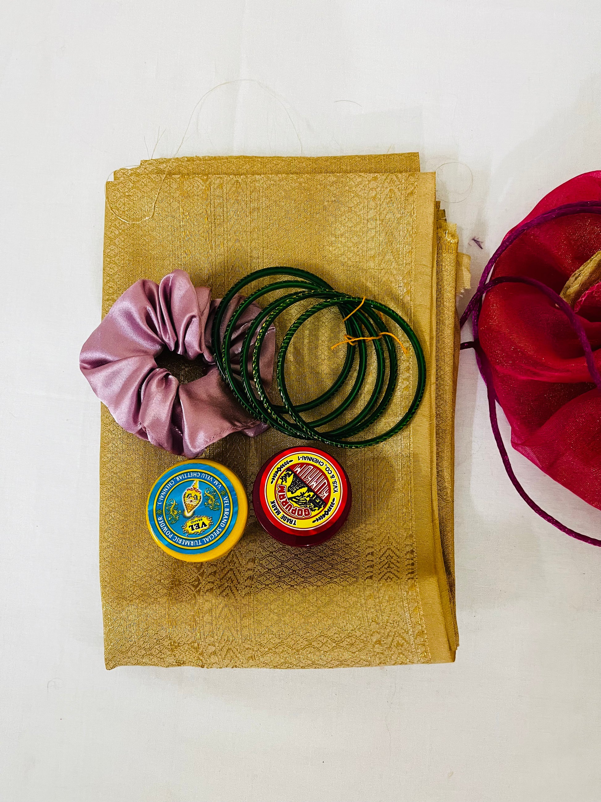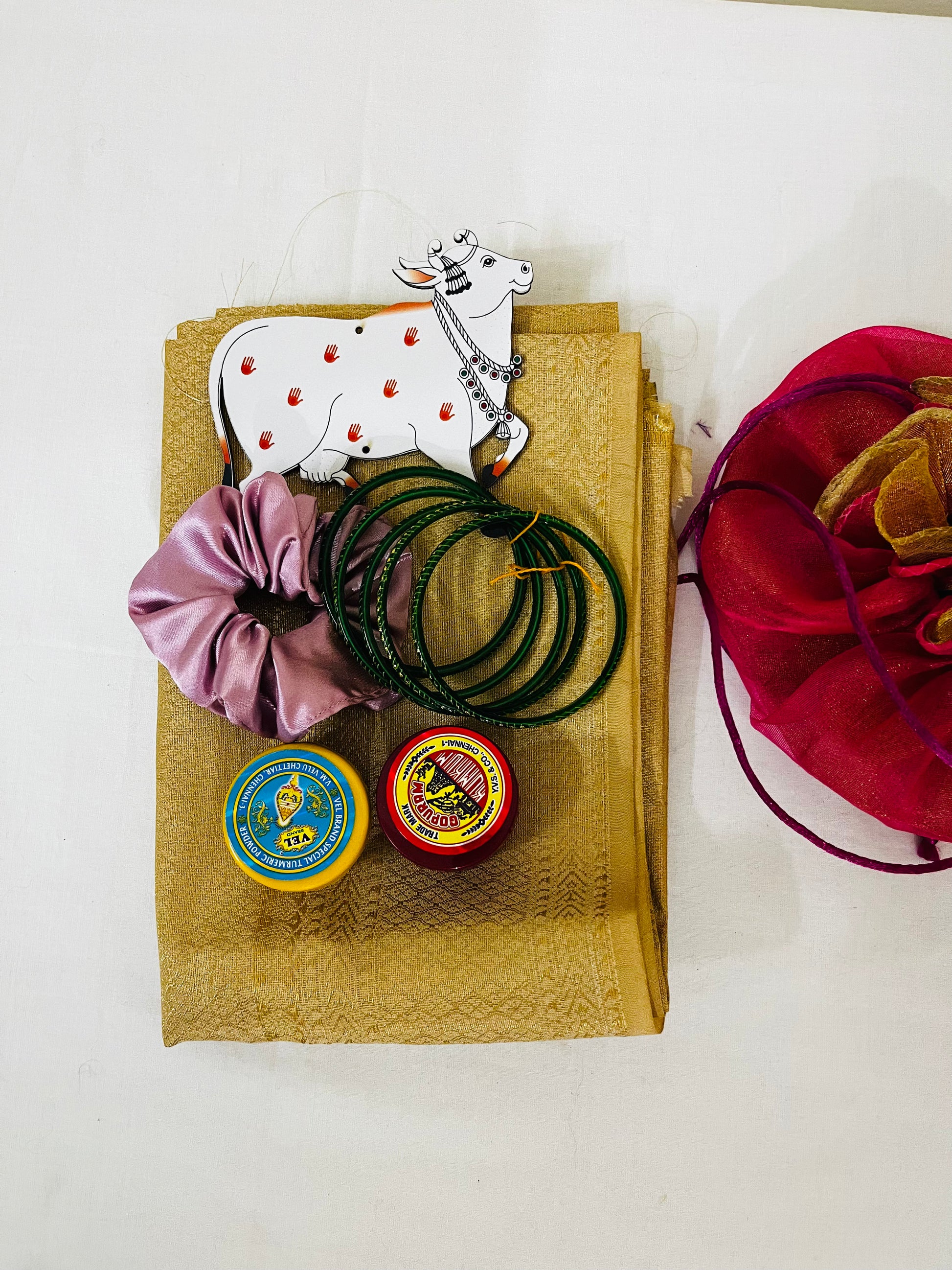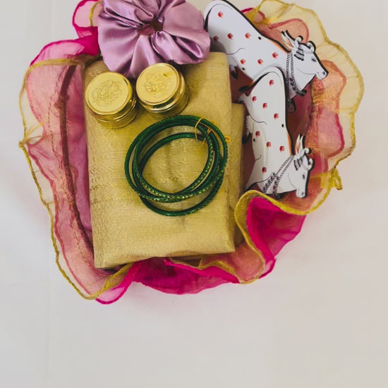 A Pooja return gift presented in a silk organza tokri bag. Each pack includes 4 glass bangles and 1 scrunchie by default, with the option to personalise with your choice of Haldi Kumkum box, and Pichwai magnet.