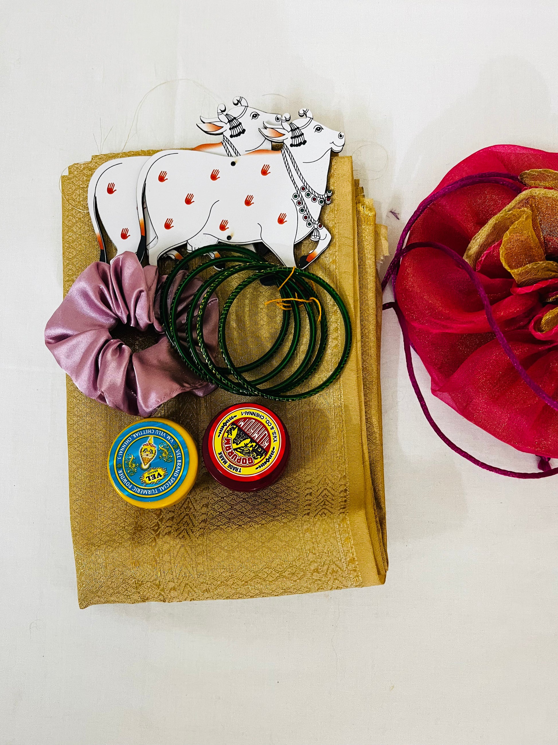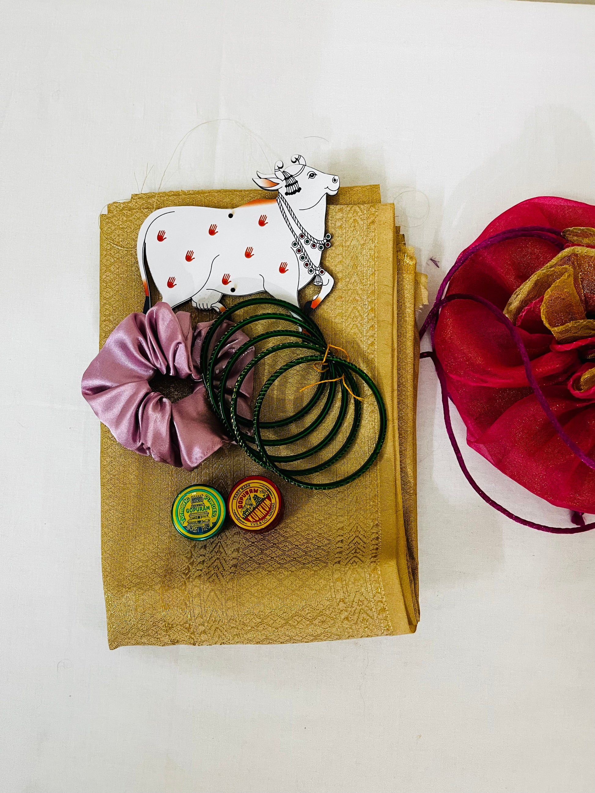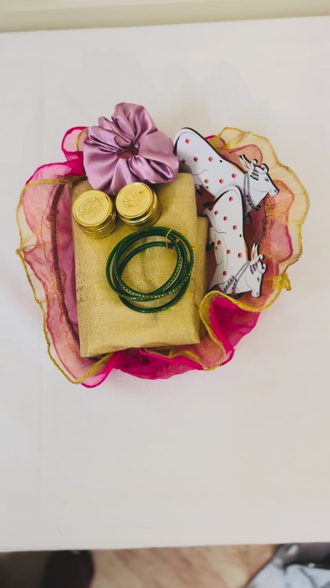 A Pooja return gift presented in a silk organza tokri bag. Each pack includes 4 glass bangles and 1 scrunchie by default, with the option to personalise with your choice of Haldi Kumkum box, and Pichwai magnet.
