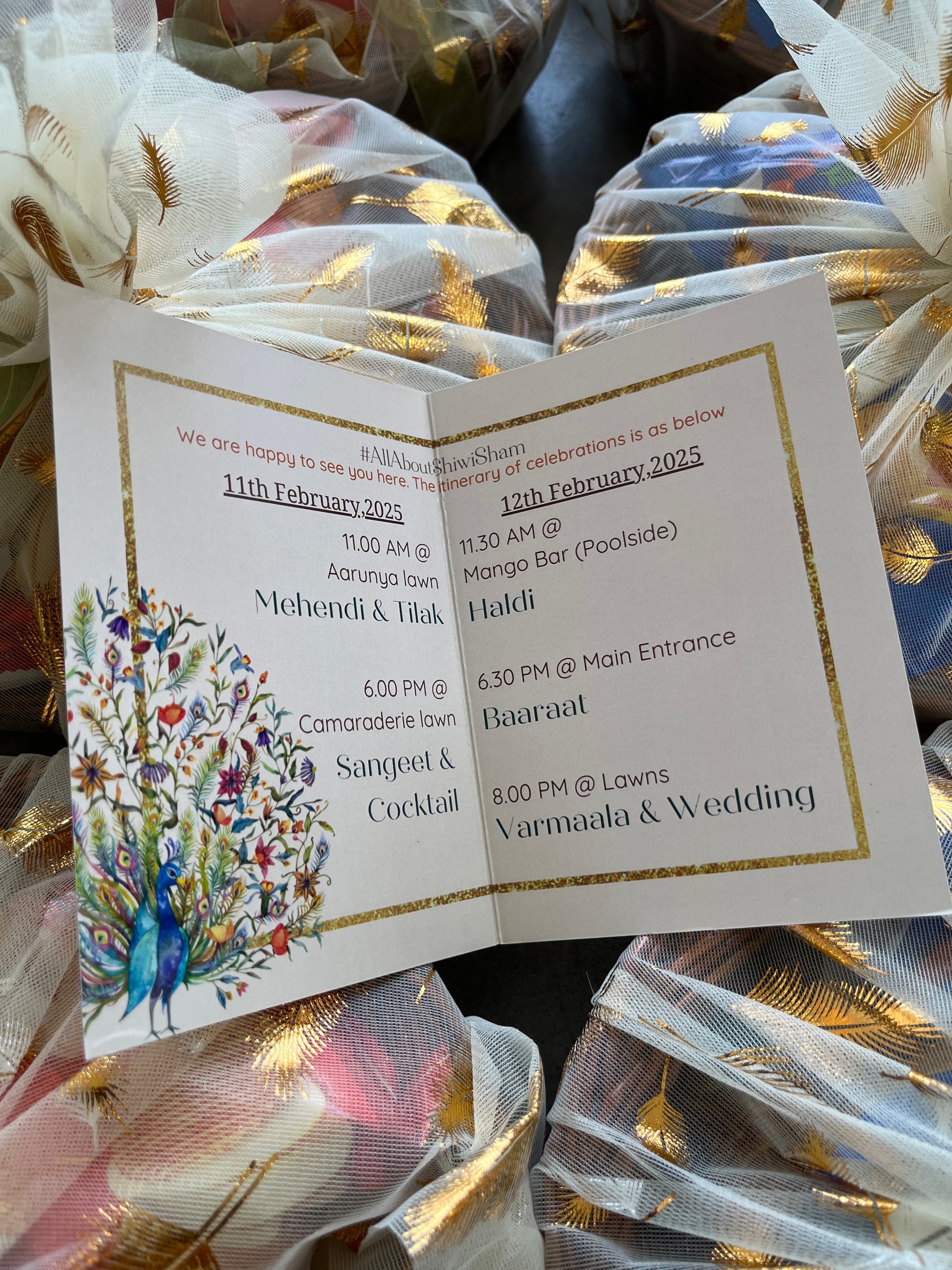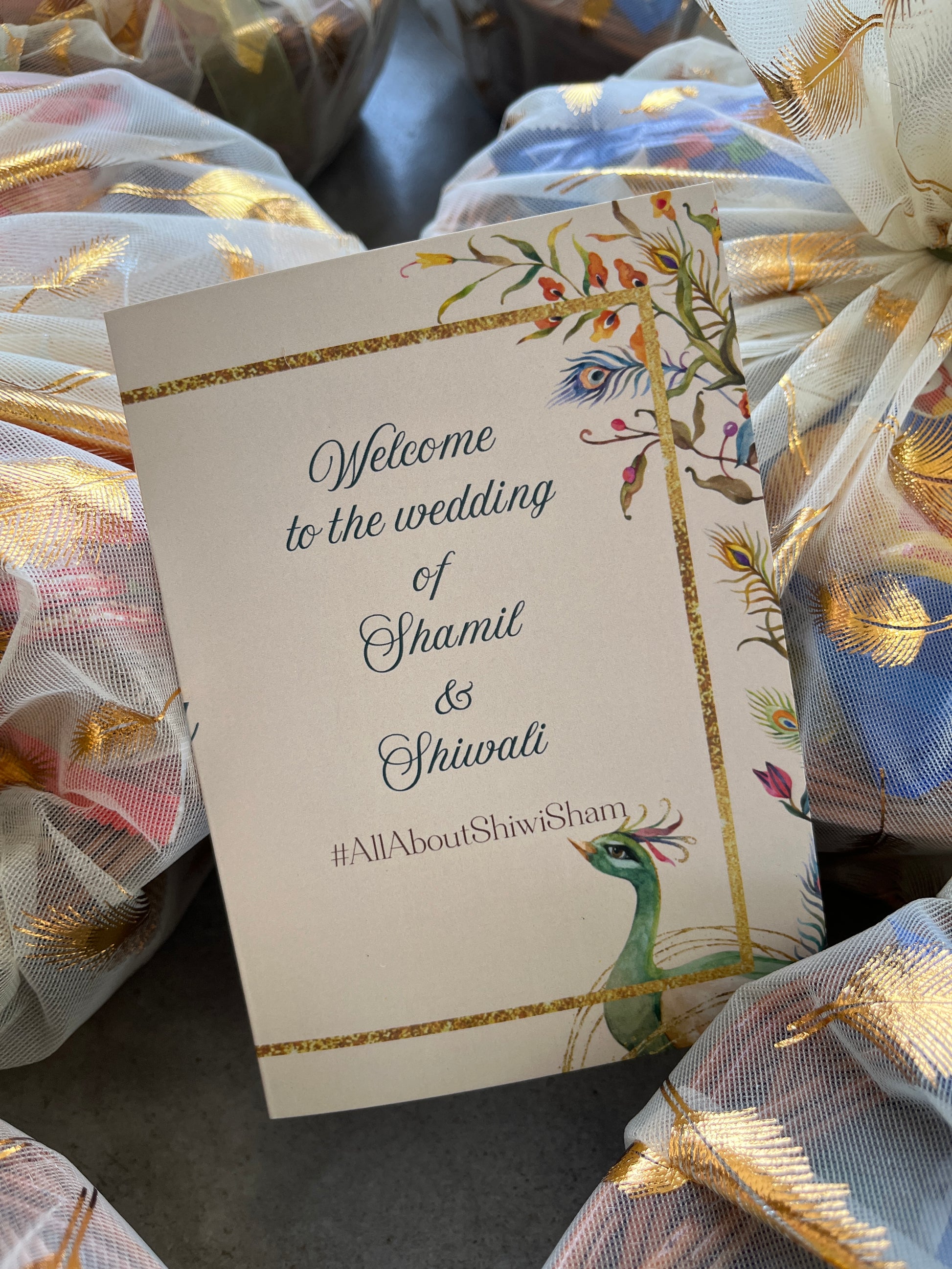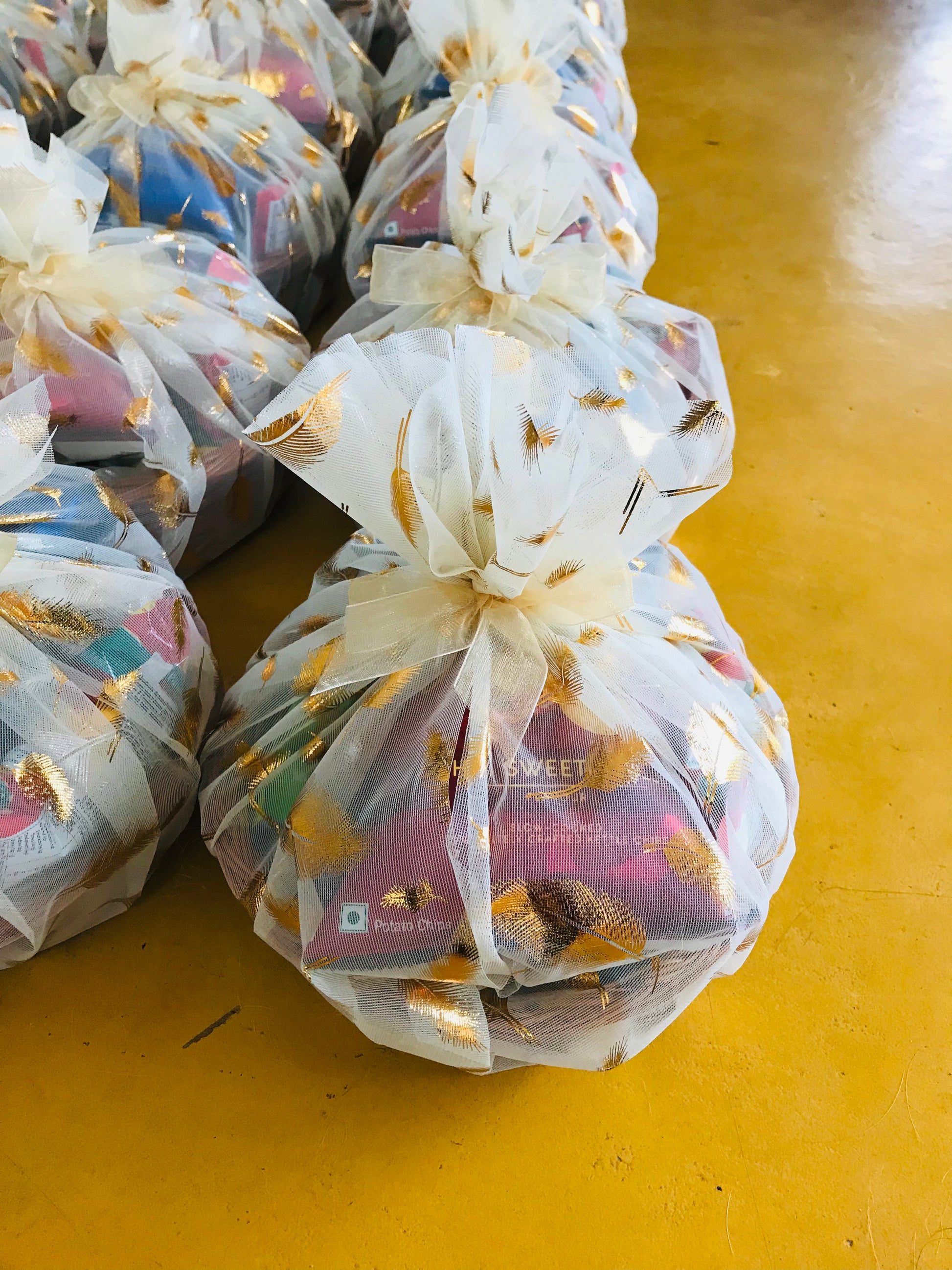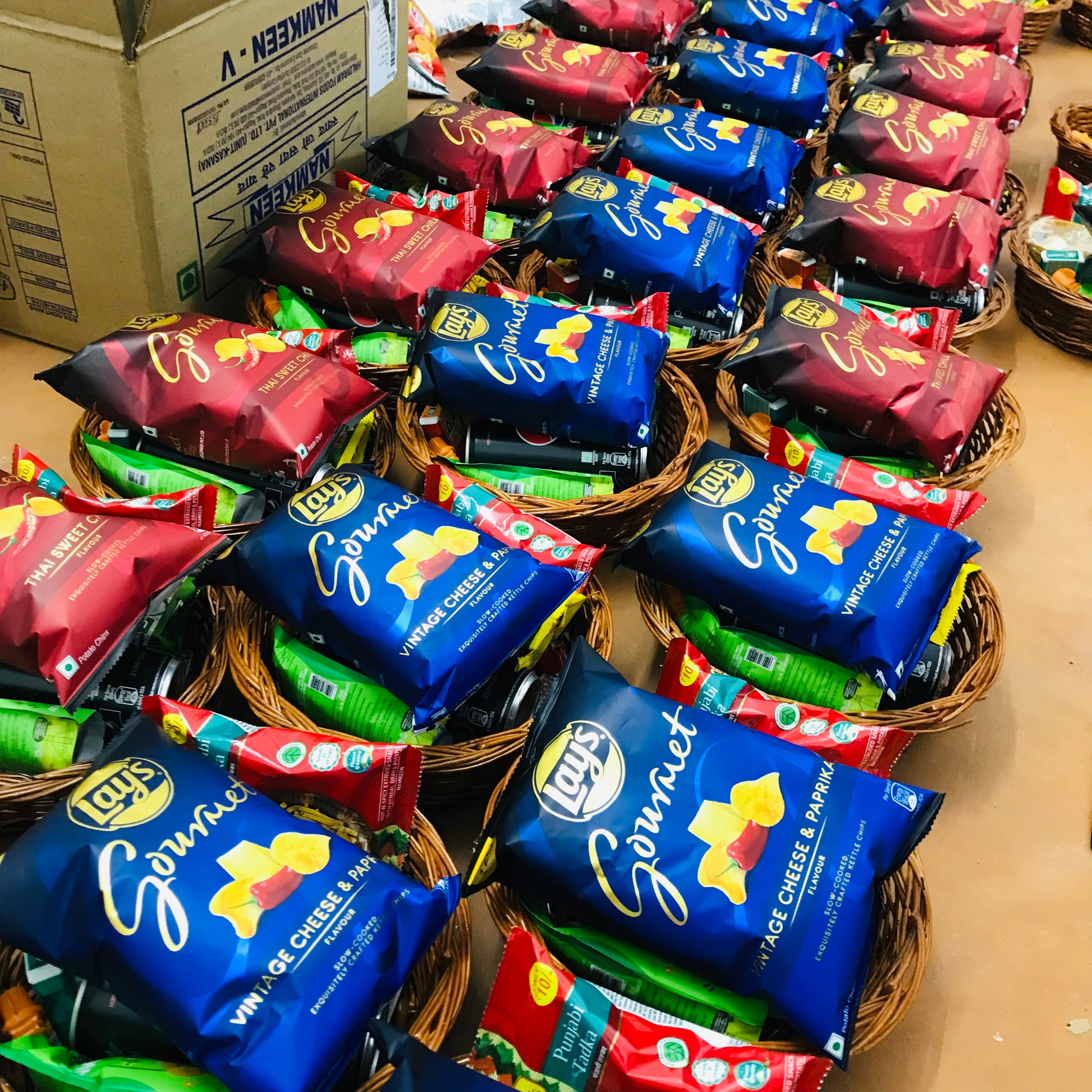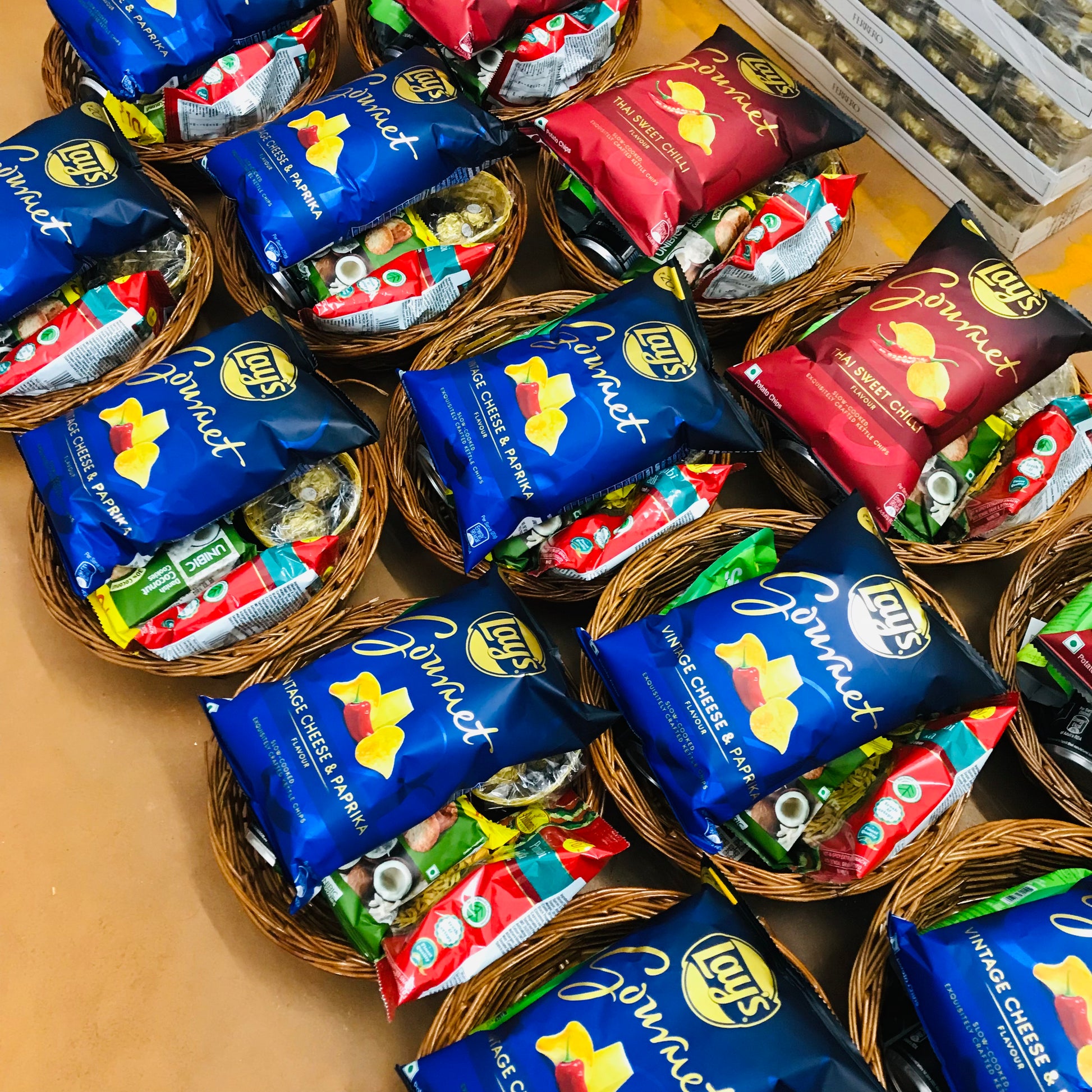 A ready-to-present welcome kit thoughtfully packed for guests. This cane basket is wrapped in a cream and gold net fabric and filled with a curated selection of snacks and drinks. Each kit includes: